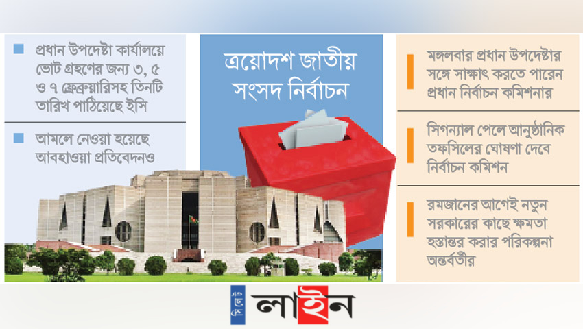 প্রধান উপদেষ্টার কার্যালয় সূত্রে জানা গেছে, নির্বাচন কমিশন থেকে প্রধান উপদেষ্টা কার্যালয়ে জাতীয় নির্বাচনের ভোটগ্রহণের জন্য ৩, ৫ ও ৭ ফেব্রুয়ারিসহ তিনটি তারিখ পাঠিয়েছে। তবে ৭ ফেব্রুয়ারি শনিবার এবং ৩ ফেব্রুয়ারি মঙ্গলবার হওয়ায় আলোচনায় জোর পেয়েছে ৫ ফেব্রুয়ারি বৃহস্পতিবার। এ ক্ষেত্রে আমলে নেওয়া হয়েছে আবহাওয়ার প্রতিবেদনও।